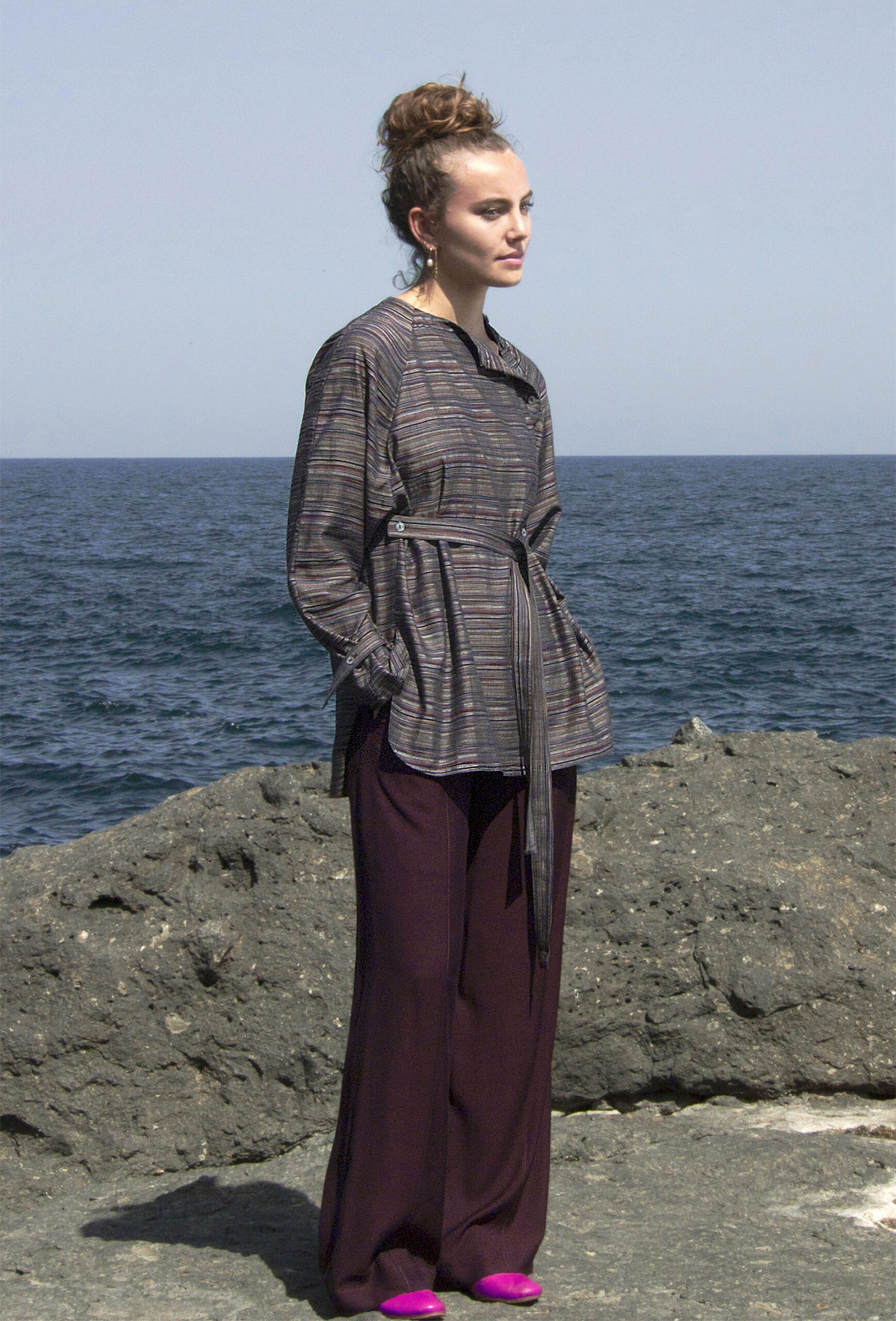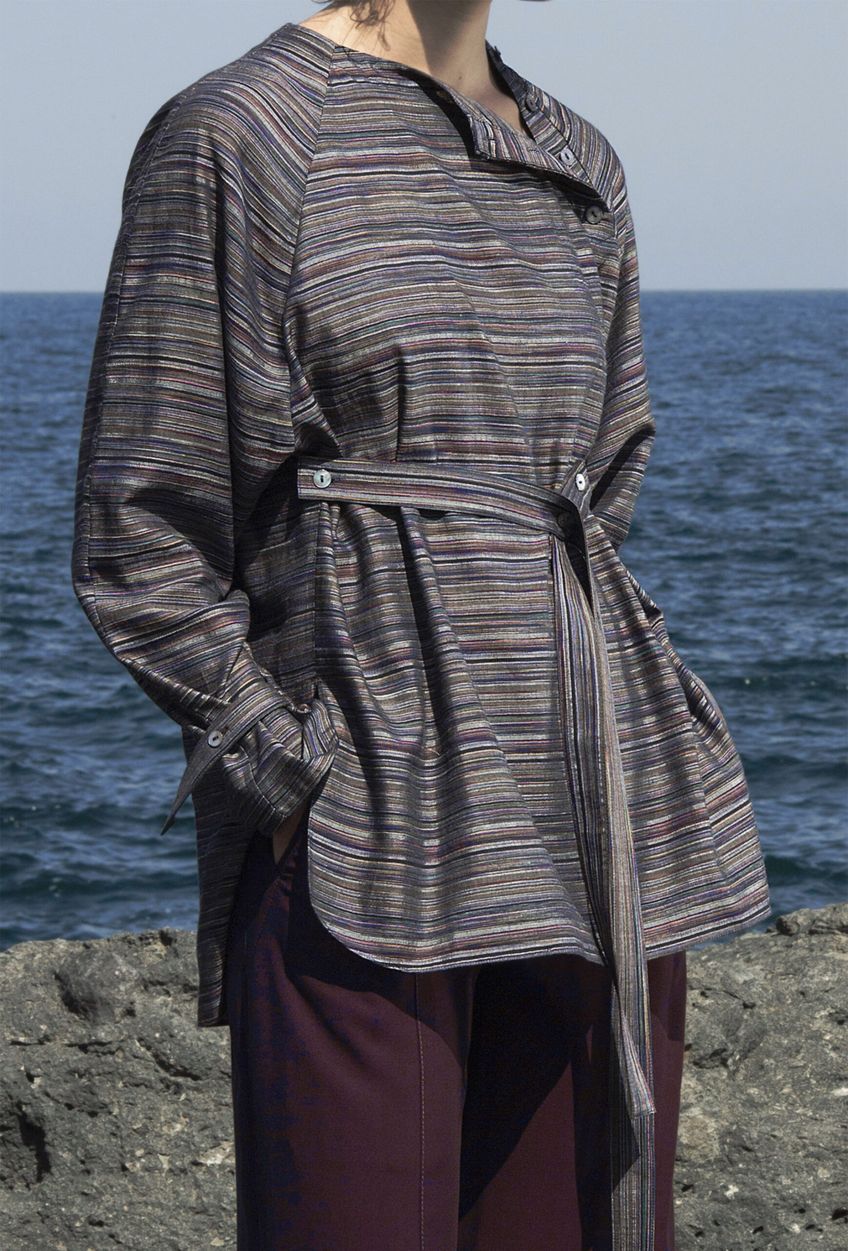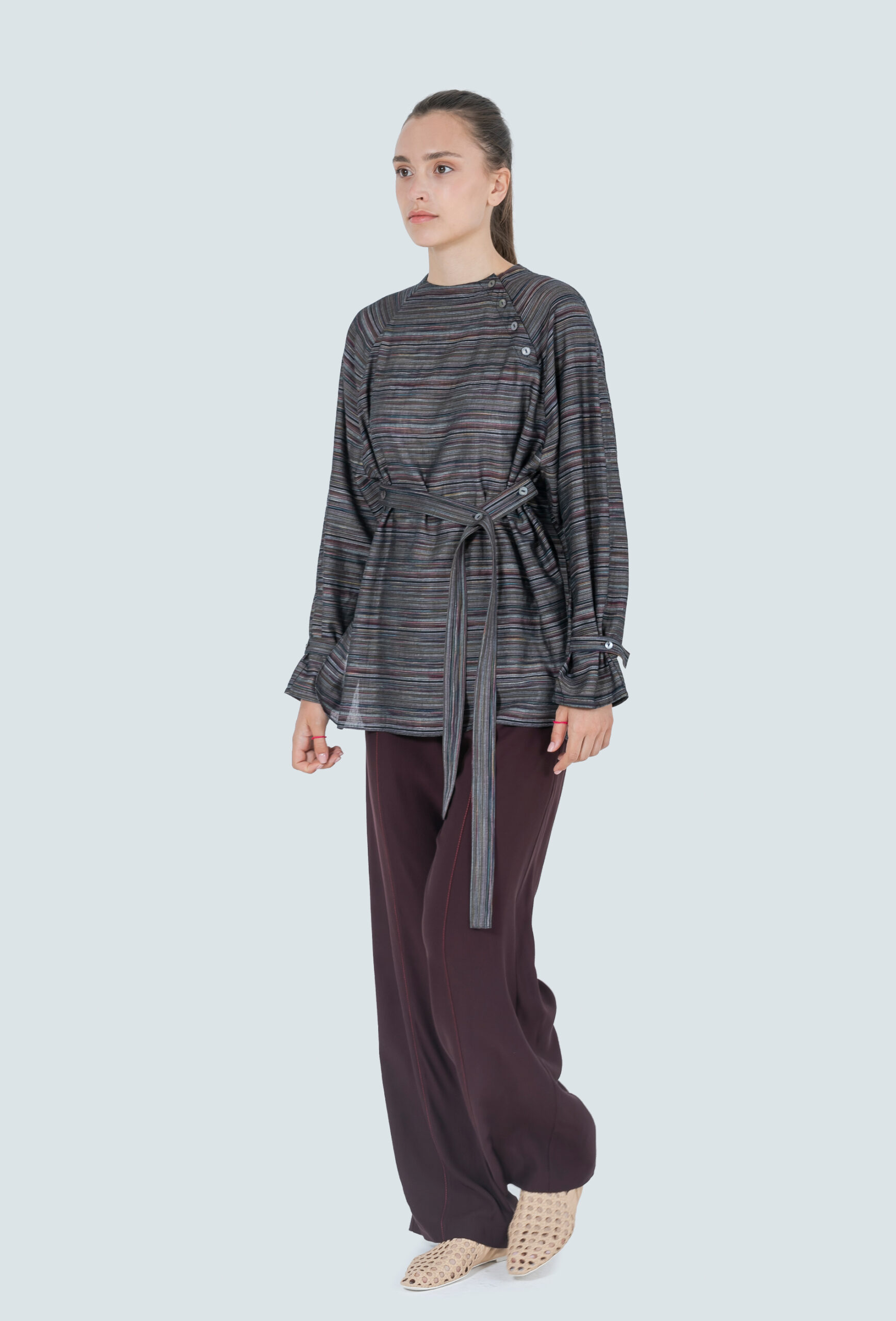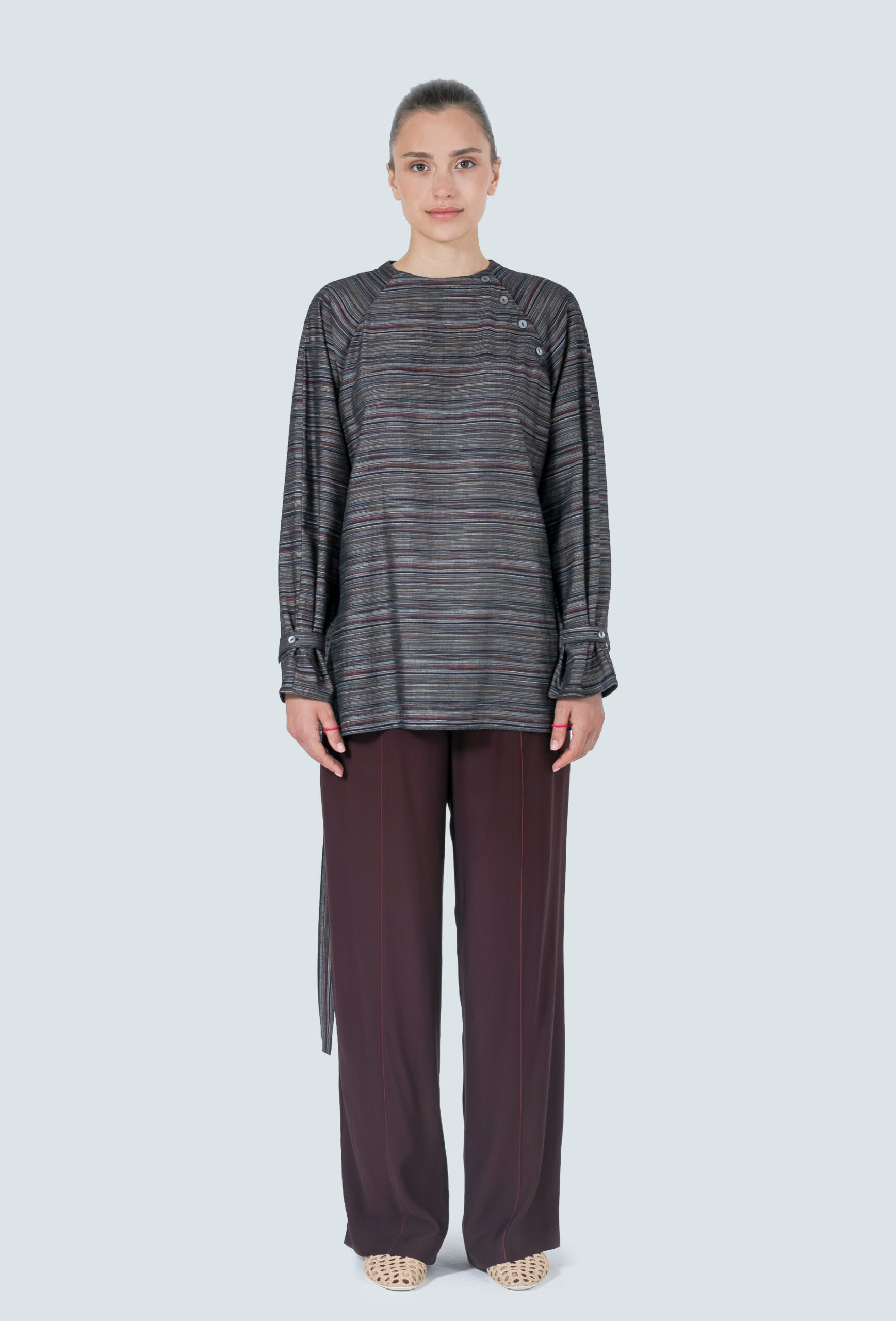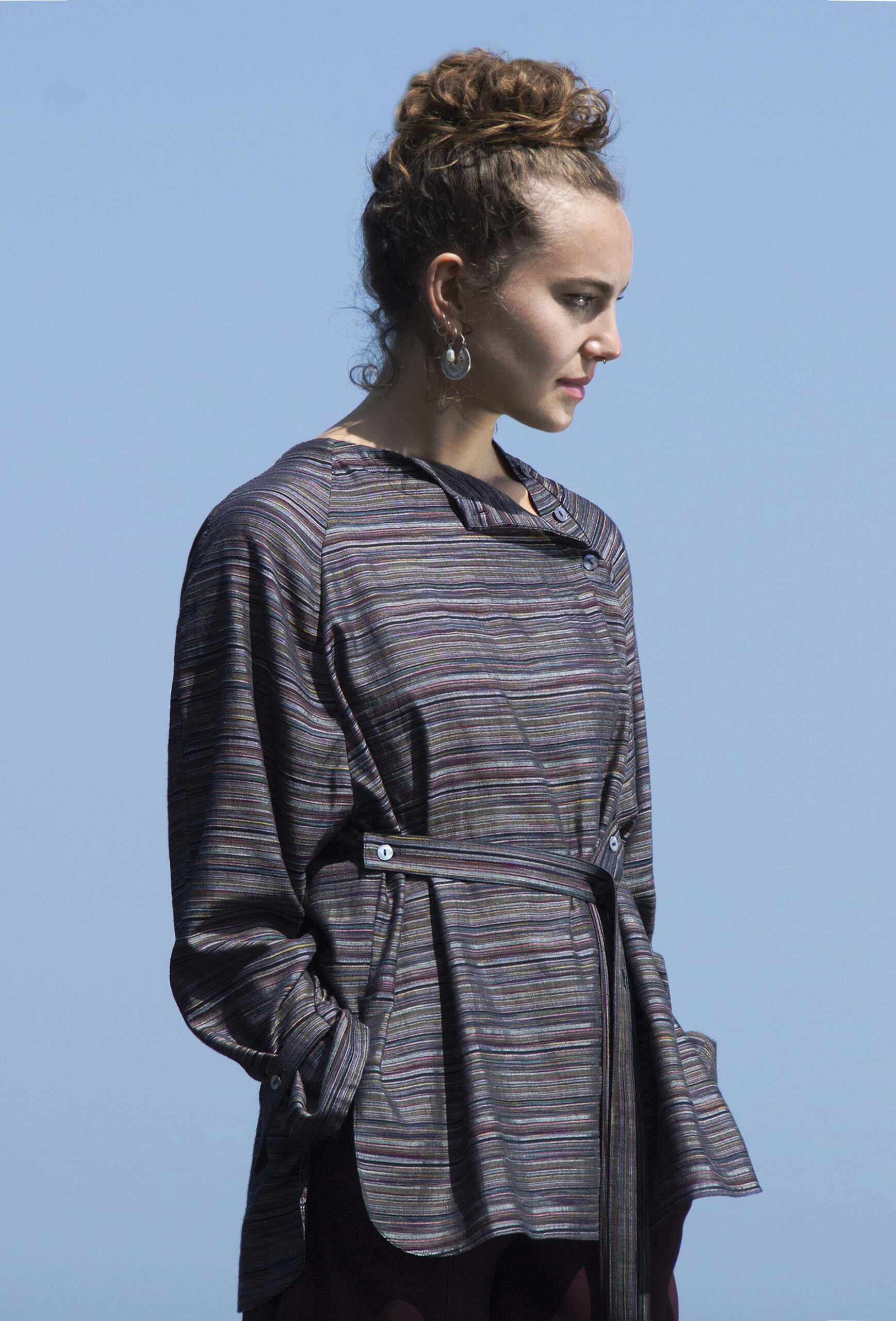 Yarasa kollu, yandan düğmeli, iplik boyalı gömlek